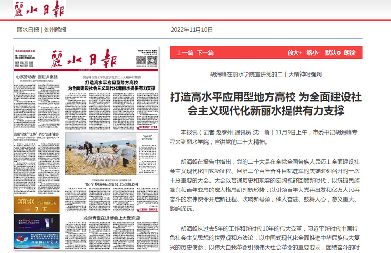 11月10日,丽水日报刊发了市委书记胡海峰来我校宣讲党的二十大会议精神的消息。