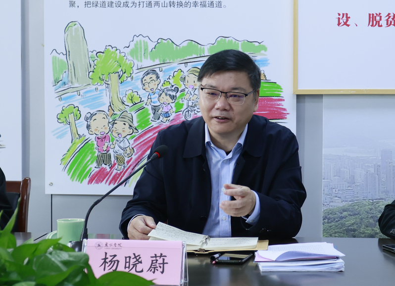 杨晓蔚表示,此次调研是为深入学习贯彻落实党的二十大精神和省第十五次党代会精神,全面了解我省习近平生态文明思想研究的基本情况,加强与我省生态文明相关科研机构的沟通和联系,共同推进习近平生态文明思想的理论研究和实践探索。在听完我校对于两山学院、两山研究院等科研单位,相关科研成果和地方服务情况的介绍之后,他指出,我校在“两山”研究和实践方面政治敏锐性高、视野宽广、水平领先,服务地方经济成效显著。他表示,此次调研很有收获、深受启发,希望之后进一步加强合作与联系。