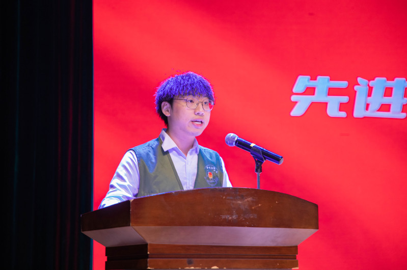 会上,先进个人代表,来自商学院的彭法荣分享了“青听兵语”社会实践团队寻访烈士家属,传承红色血脉的故事,他号召大学生积极投身于暑期社会实践活动当中,让青春在全面建设社会主义现代化国家的火热实践中绽放绚丽之花。