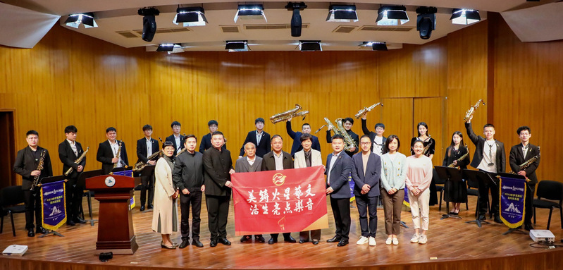 活动伊始,郭献进为“文艺星火铸美 音乐点亮生活”艺术展演团队——4分33秒萨克斯风室内乐乐团授旗。
