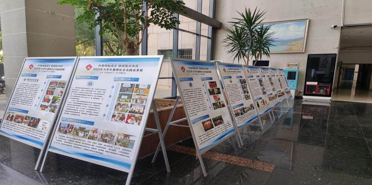近日,浙江省关心下一代工作委员会“红船领航成长,强国复兴有我”2022年大学生暑期社会实践成果巡展在我校思齐楼一楼大厅举行,来自全省22所高校的优秀暑期社会实践成果吸引了同学们驻足观看。