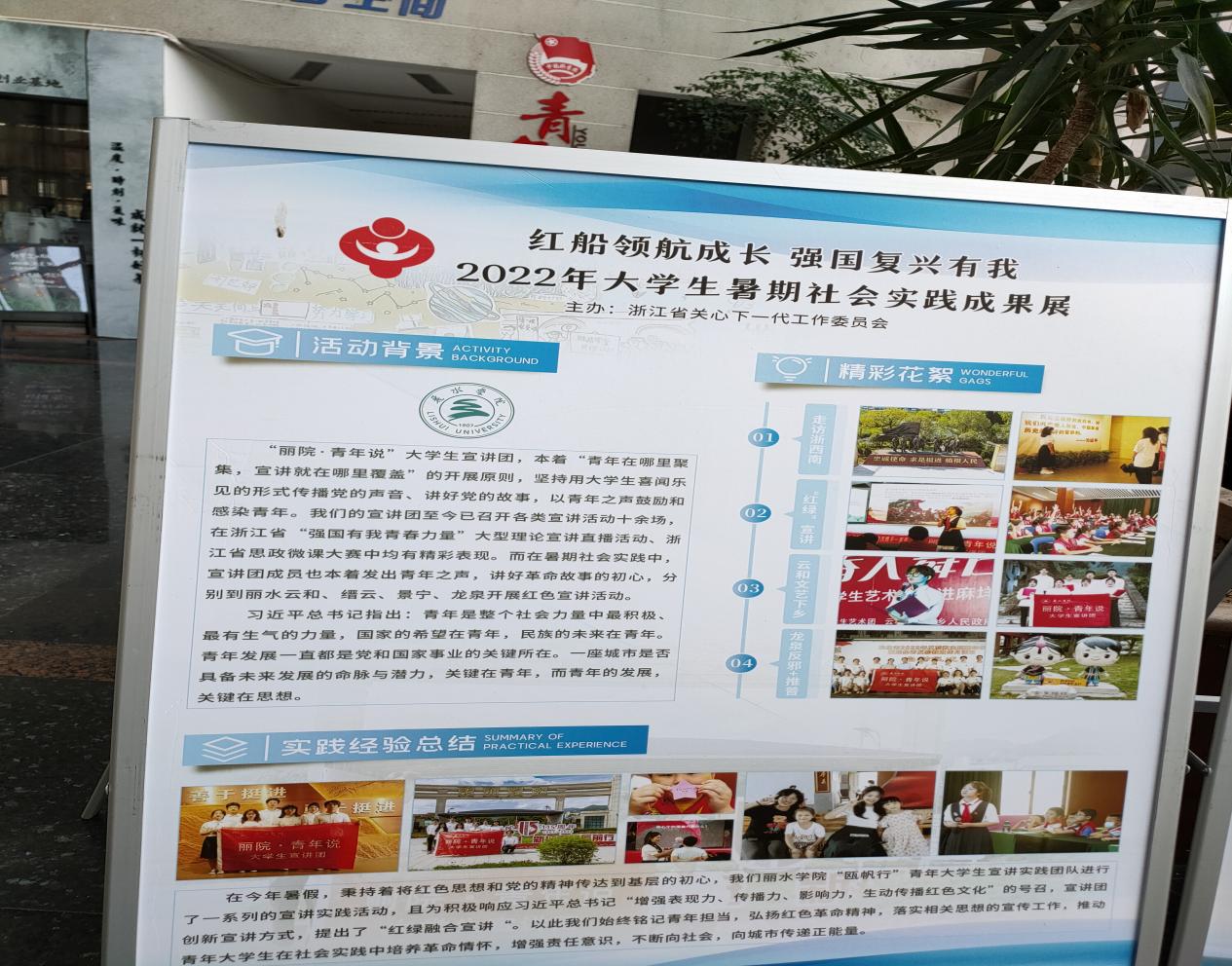 展出内容包含浙江大学、西湖大学等多所高校参与社会实践的活动背景、精彩花絮以及实践经验总结等。校团委选送的“丽院·青年说”大学宣讲团在今年暑期实践活动中积极作为,切合活动主题,成功入选本次巡展。