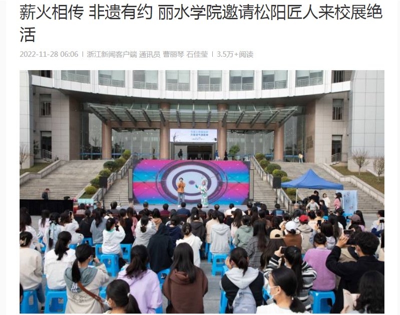 11月28日,浙江新闻客户端报道了我校和松阳县文化广电和旅游体育局共同主办的“薪火相传 非遗有约”--非遗进校园活动。