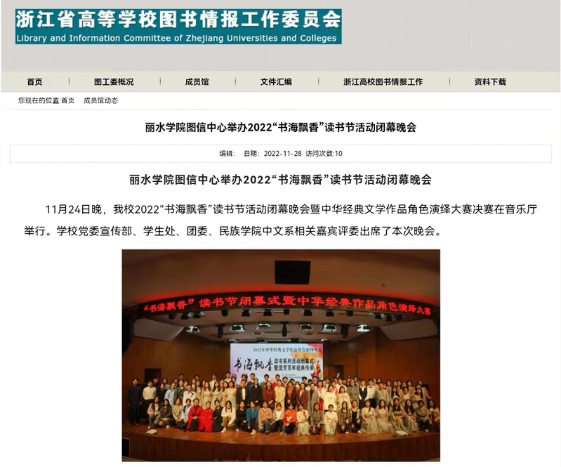 11月28日,浙江省高等学校图书情报工作委员会网站刊登了我校图书与信息服务中心举办的2022“书海飘香”读书节活动闭幕晚会暨中华经典文学作品角色演绎大赛的消息。