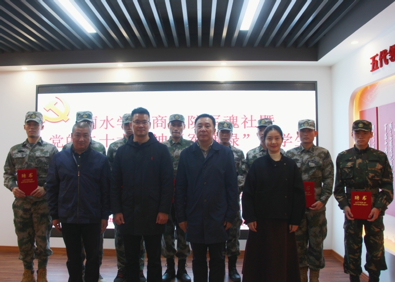 成立仪式上,莲都区退役军人事务局、我校学生处相关负责人分别为二十大精神“军魂绿”宣讲团及商学院军魂社授旗,并为宣讲团成员颁发聘书。