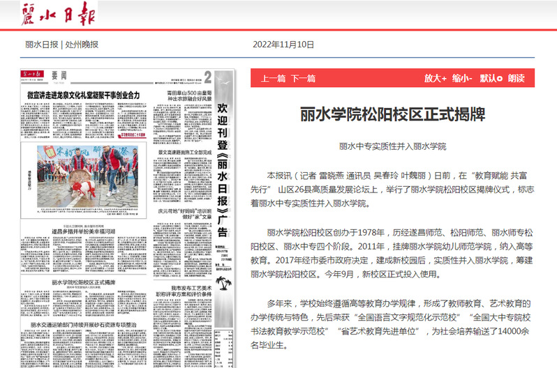 11月10日,丽水日报刊发了我校松阳校区正式揭牌的消息。