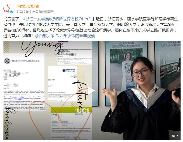 6月22日,中国妇女报微博发布了我校医学院学生收到5所世界名校offer的消息。