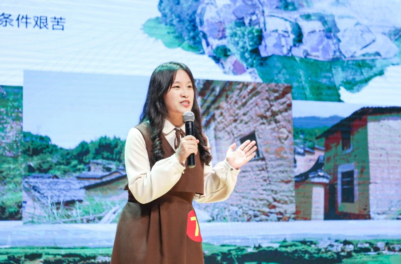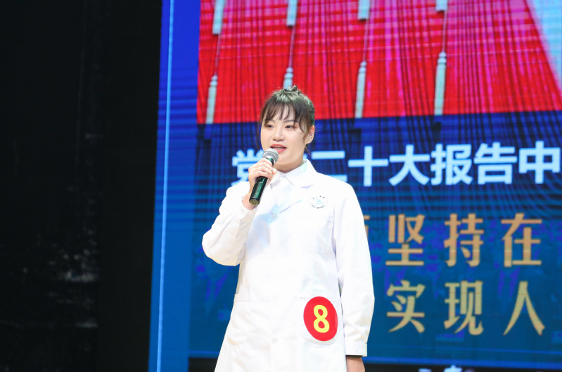 在主题演讲环节,选手们围绕“党的二十大报告中,最有共鸣的一句话”进行演讲。他们才思敏捷,结合自己身边的故事,用青年喜闻乐见的方式宣讲,有的打扮成带货主播,讲述自己的助农经历;有的在台上跳起健美操,以45度的青春为题号召青年要蓄势待发,接续奋斗;有的结合自己的成长经历,将家乡的文化、历史与二十大报告金句融合。