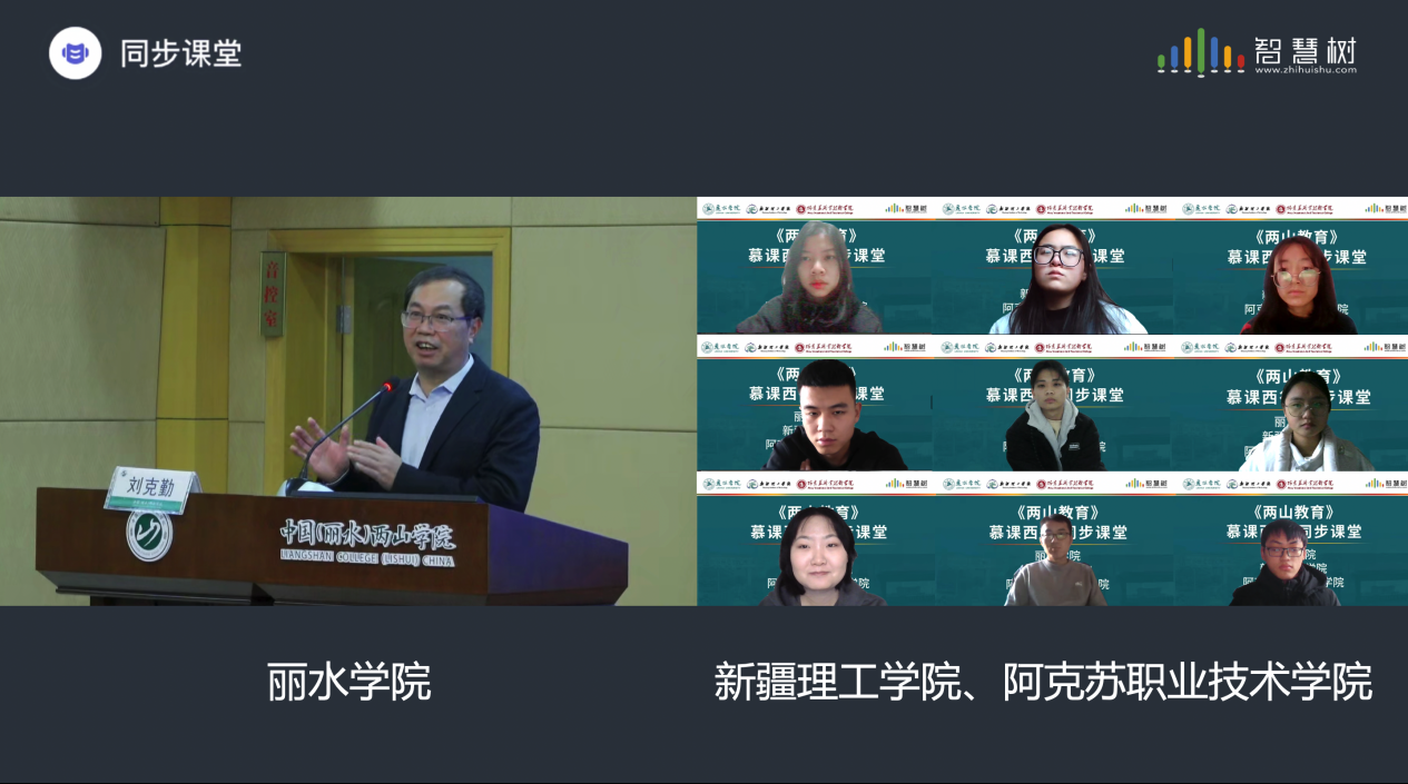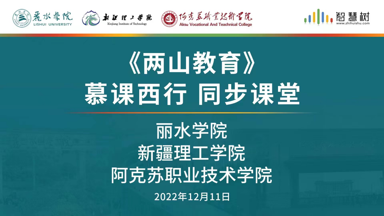 为积极响应国家教育部高教司“慕课西行”号召,促进东西部学校创新教学理念、推进教学改革,提升人才培养质量,针对西部边疆高校提出的课程需求,日前,丽水学院与智慧树团队合作,联合新疆理工学院、阿克苏职业技术学院共同推动《两山教育》课程走进西部边疆高校课堂,切实为推动东西部教育的高质量发展贡献智慧与力量。