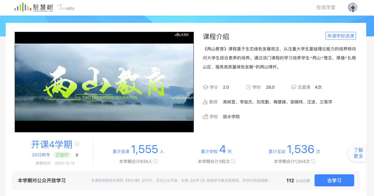 《两山教育》是我校一门全新特色课程,是基于生态绿色发展观念,将习近平总书记关于“绿水青山就是金山银山”理念的指导思想落实在教育领域。目前课程已录制线上课程视频39个,合计480分钟,已全部上线智慧树和学习强国平台。自2021年9月上线运行以来,共有四所高校的1555名同学在线上学习了这门课程。截止目前,《两山教育》已被列为“浙江省一流本科课程”、浙江省“十四五”新世纪教改项目,目前课程团队正在积极申报建设国家一流课程。