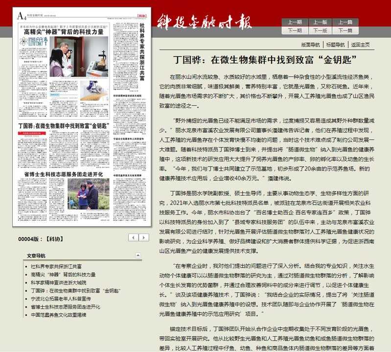 12月16日,《科技金融时报》刊发了我校生态学院丁国骅博士为鱼类肠道微生物贡献智力支持的消息。
