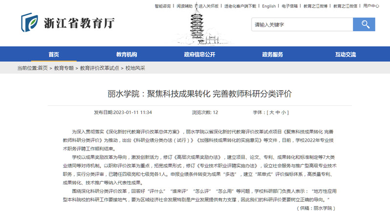 1月11日,浙江省教育厅官方网站刊发了我校聚焦科技成果转化完善教师科研分类评价的典型报道。