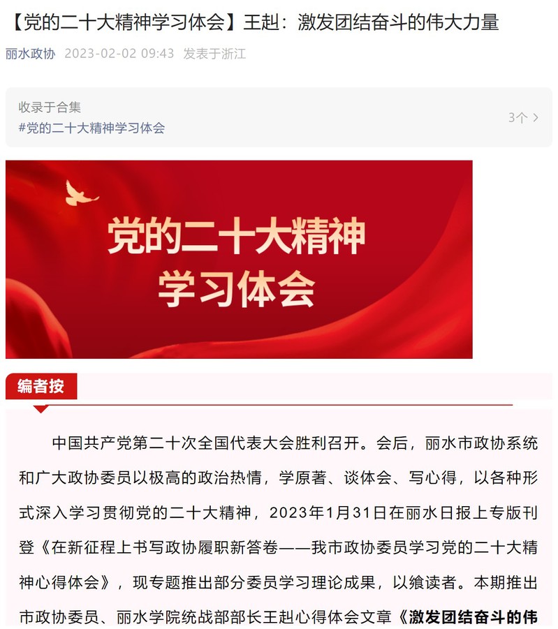2月2日,丽水政协微信公众号在党的二十大精神学习体会专栏发布了市政协委员,校党委委员、统战部部长王赳的文章《激发团结奋斗的伟大力量》。