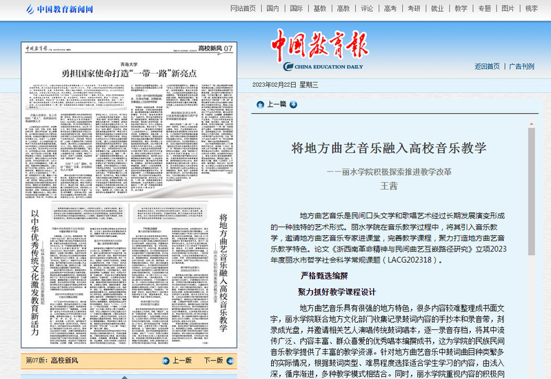 2月22日,《中国教育报》刊发了我校民族学院王茜老师的署名文章《将地方曲艺音乐融入高校音乐教学》,文章通过音乐教学改革这个点展示了我校积极探索推进教学改革的成效。