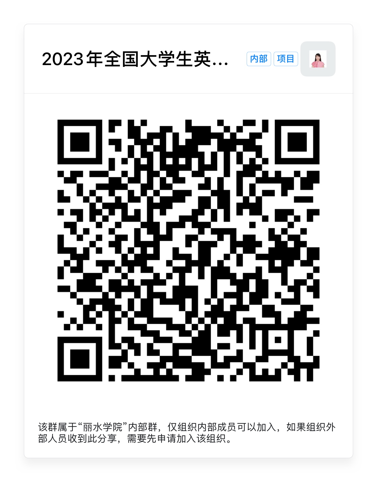 若有关于比赛的问题,B、C类学生请联系丽水学院民族学院何青芒老师(15925723466/523466);D类学生请联系丽水学院职业技术学院陈伟红老师(13757098622/628622)。请B、C类报名参赛的同学扫码加入钉钉群:2023年全国大学生英语竞赛(B、C类)”,D类报名参赛的同学加入钉钉群:2023年全国大学生英语竞赛(D类)。入群后修改群昵称为:班级+姓名,以便统一通知和联系。入群二维码如下图: