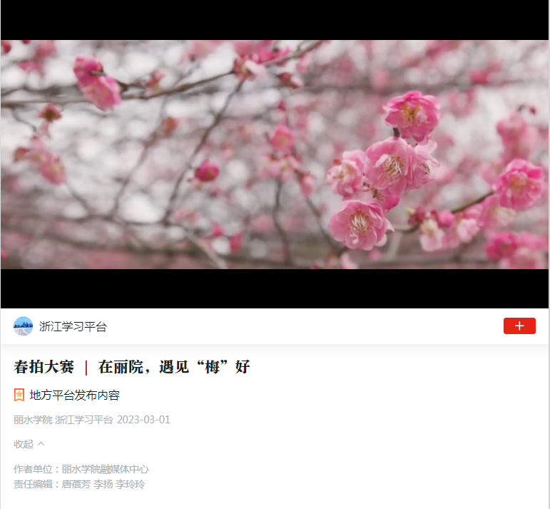 3月1日,学习强国浙江学习平台刊发了展示我校美丽风景视频《在丽院,遇见“梅”好》。