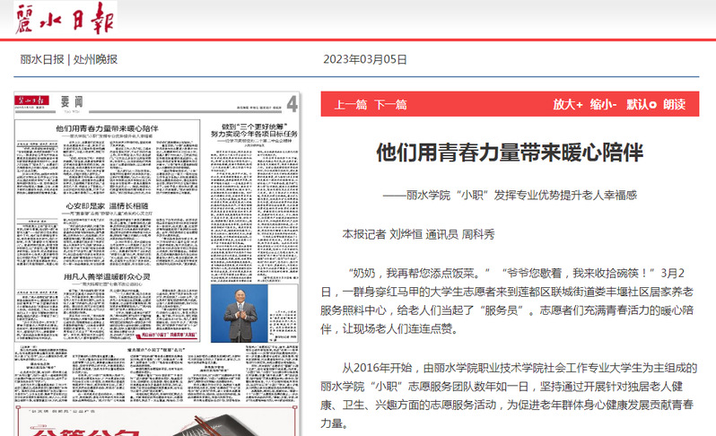 3月5日,丽水日报刊发了我校职业技术学院学子赴莲都区联城街道娄丰堰社区开展志愿服务活动。