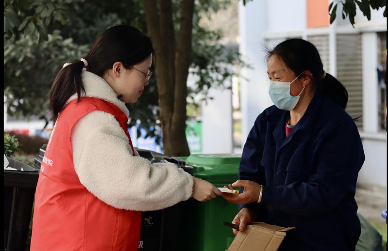 举行“暖心送物,真情相守”志愿活动。志愿者们制作祝福贺卡,前往食堂、街道等地,将50余份写满祝福语句的卡片和小礼物送到工作人员手中,并对他们一直以来的辛勤付出表示感谢。在帮助他们完成工作后,一位环卫工人与我们分享道:“虽然我的工作很辛苦,但想到能为城市带来一份洁净,就很幸福。今天我感受到了大家对我的深深关怀,也给了我无穷力量。”