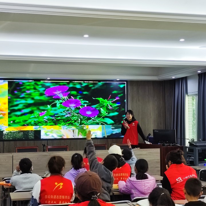 随后,植物课堂实践团队志愿者结合专业知识,带领小朋友们一起学习植物的基本知识,向孩子们科普常见的植物苗木。在分辨植物环节,孩子们兴致盎然、跃跃欲试,一个个争先恐后上前仔细观摩,或是动手摸一摸、凑近闻一闻,或向志愿者们询问确认。活动提升了孩子们对植物的认知兴趣,又增加了他们对植物知识的了解。