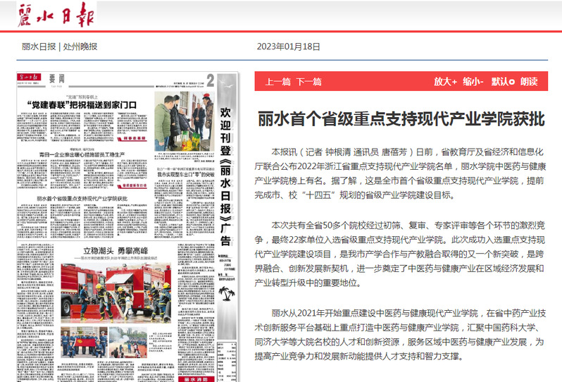 1月18日,丽水日报刊发了我校获批首个省级重点支持现代产业学院的消息。
