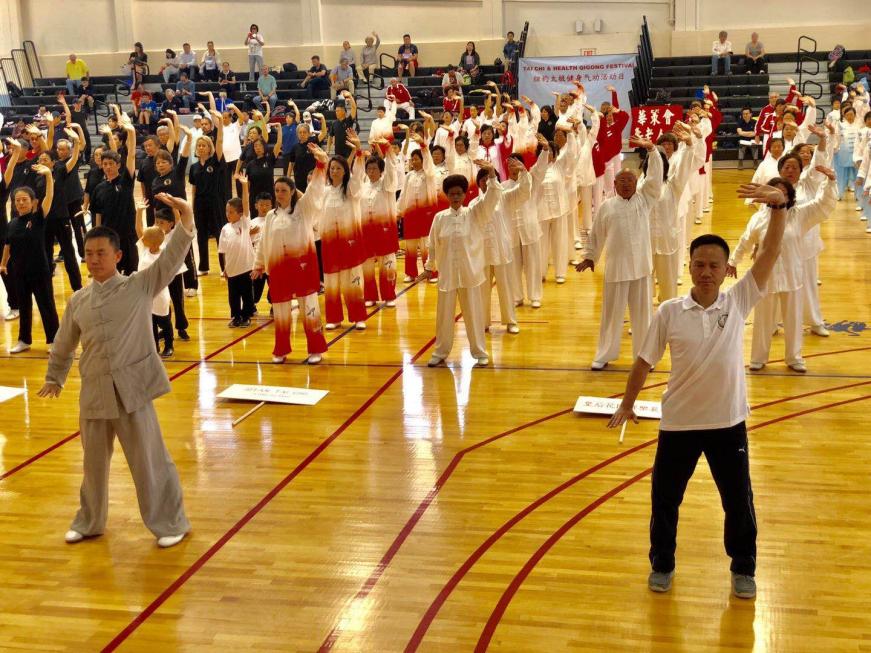 (2019年6月,晁胜杰带领400多位纽约健身气功爱好者集体练习八段锦)