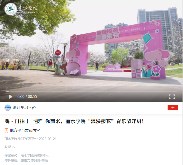 3月21日,学习强国浙江学习平台刊发了我校举行“浪漫樱花”音乐节的消息。