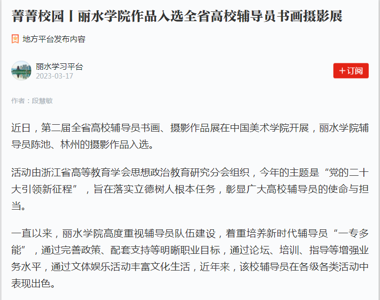 3月14日,学习强国丽水学习平台刊发了我校辅导员陈池、林州的摄影作品入选第二届全省高校辅导员书画、摄影作品展的消息。