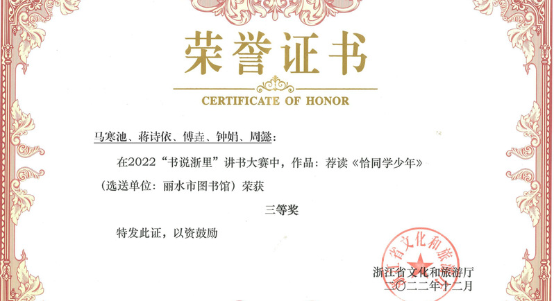 近日,浙江省文化和旅游厅公布了2022年全民阅读月系列活动之“书说浙里 共读共富”讲书大赛结果,我校图信中心选送的作品《恰同学少年》荣获三等奖(作者:教师教育学院马寒池等)。
