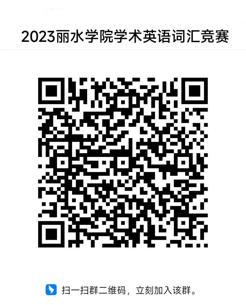 8. 参赛方式:我校采取团队报名形式,报名截止到4月13日,欢迎大家踊跃报名。欲报名参赛的同学请用微信扫下面的团队报名二维码填写信息报名,初赛场次请选择4月15日周六傍晚19:00-20:00,一个工作日后使用报名手机号登录乐词APP查看和确认准考证信息。请参赛同学务必扫下面的二维码加入“2023丽水学院学术英语词汇竞赛”钉钉群,以便后续通知。咨询电话:樊老师,689722。