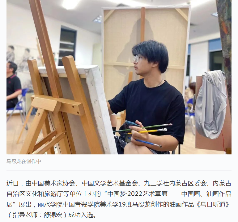 3月27日,学习强国丽水学习平台刊发了我校学生马忍龙油画作品入选国家级展览的新闻。