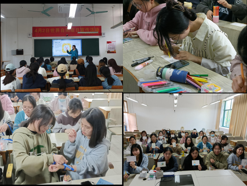 “你和我,都是宇宙的孩子,跟植物、星辰没什么两样。”之后,协会联合开馨儿童发展中心举办了儿童孤独症宣传分享会。机构老师借助孤独症宣传影片与孤独症儿童纪录片,并结合图文的展示带领同学们走进孤独症儿童的内心世界,体会、理解他们目前的处境。分享会结束后,志愿者还与参加活动的同学一起用画笔绘制和写下对孤独症儿童的美好祝愿。