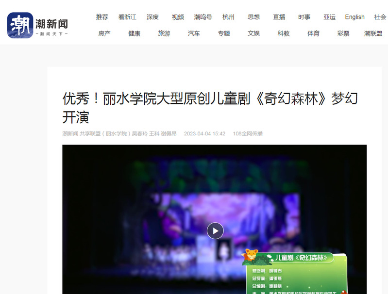 4月4日,潮新闻客户端刊发了我校大型原创儿童剧《奇幻森林》在丽水大剧院梦幻开演的消息。