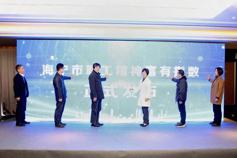 何义珠在会上作了题为《创造活力增强耐力:高质量公共文化服务的必然选择》的主旨发言,并同与会嘉宾一起发布了海宁市职工精神富有指数。