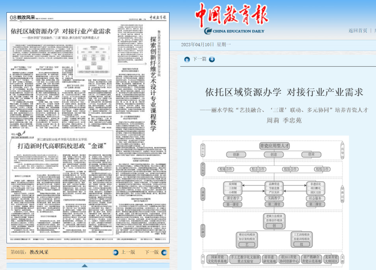 4月10日,《中国教育报》刊发了我校中国青瓷学周莉、季忠苑两位老师共同撰写的文章《依托区域资源办学对接行业产业需求——丽水学院“艺技融合、‘三课’联动、多元协同”培养青瓷人才》,文章系中国青瓷学院青瓷应用型创新人才培养的成果体现。