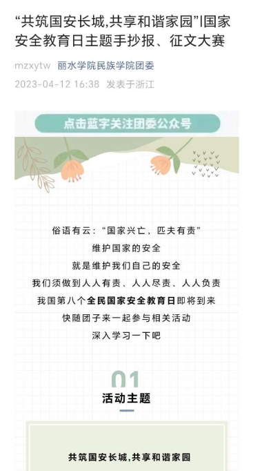 国家安全人人有责,民族学院先后组织了国家安全教育日主题手抄报、征文大赛,退伍复学军人分享国家安全感悟等系列活动,旨在向学生普及国家安全知识,增强学生“居安思危,知危图安”的思想意识。
