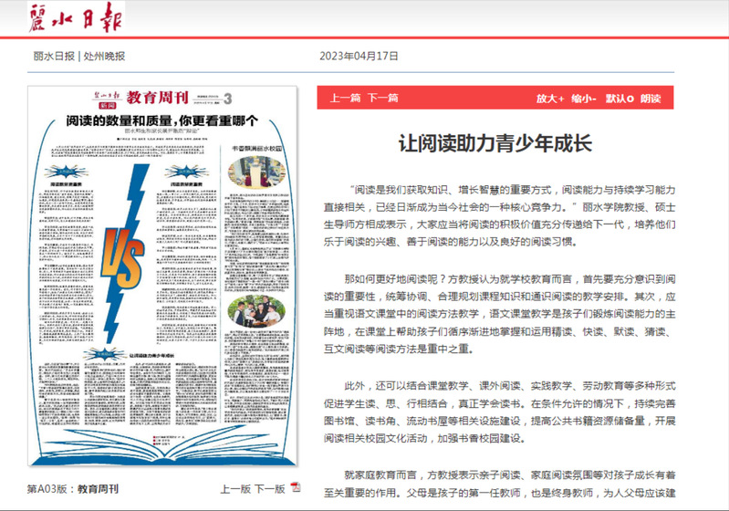 4月17日,丽水日报刊发了我校教师教育学院方相成文章《让阅读助力青年成长》。