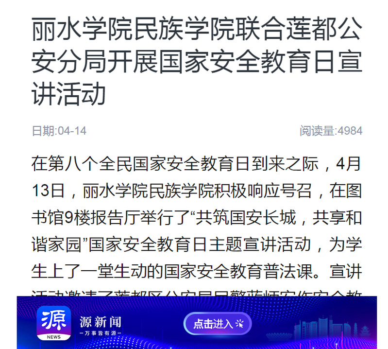 4月14日,源新闻客户端刊发了于我校民族学院联合莲都公安分局举行“共筑国安长城,共享和谐家园”国家安全教育日主题宣讲活动的消息。