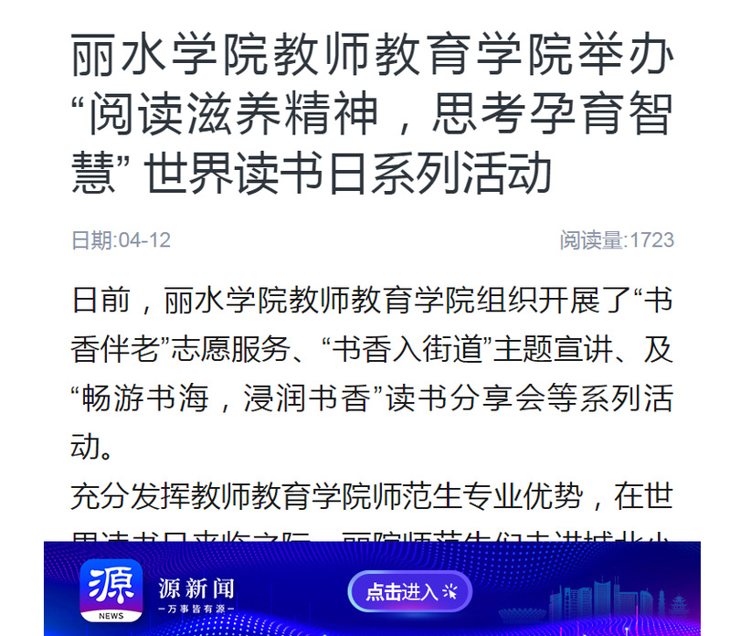 4月12日,源新闻客户端刊发了我校教师教育学院组织开展的“书香伴老”志愿服务、“书香入街道”主题宣讲、及“畅游书海,浸润书香”读书分享会等系列活动的消息。
