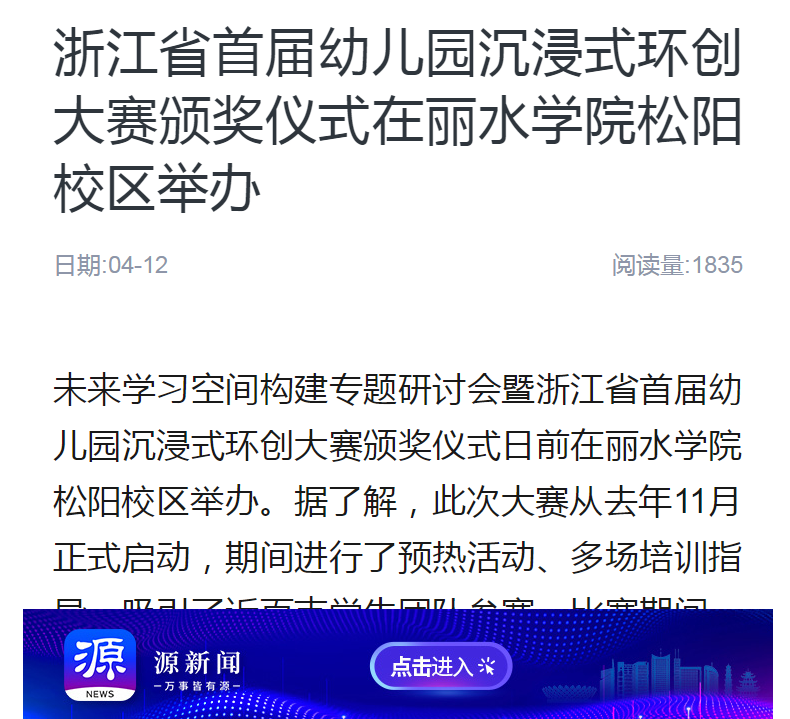 4月12日,源新闻客户端刊发了我校松阳校区举办的未来学习空间构建专题研讨会暨浙江省首届幼儿园沉浸式环创大赛颁奖仪式。