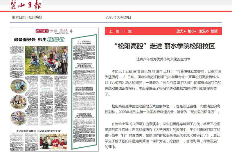3月20日,丽水日报刊发了我校松阳校区邀请“松阳高腔”进校,弘扬优秀传统文化,加强校地文化交流互融,推动文化共富的消息。