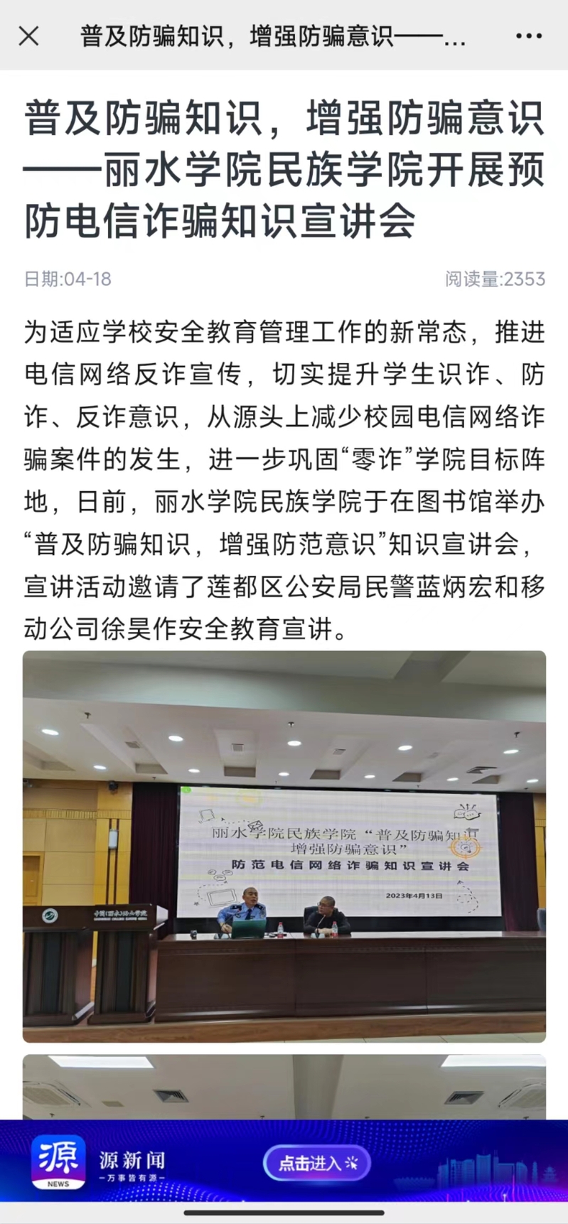 4月18日,源新闻客户端刊发了关于我校民族学院开展预防电信诈骗知识宣讲会的消息。