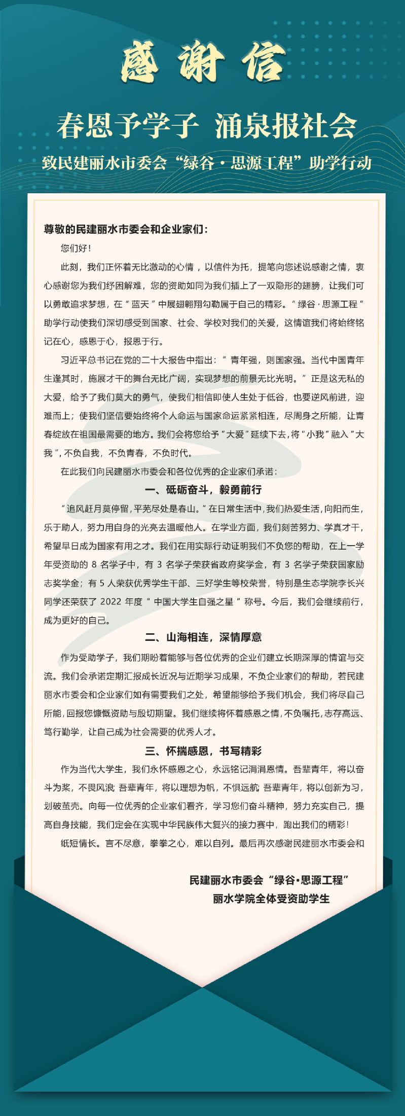 近日,我校受资助学生以集体名义写感谢信向民建市委会和企业家们致谢。感恩民建市委会“绿谷·思源工程”助学行动,感谢民建企业家对他们的资助。他们也郑重承诺:砥砺奋斗,勇毅前行;山海相连,深情厚意;怀揣感恩,书写精彩。