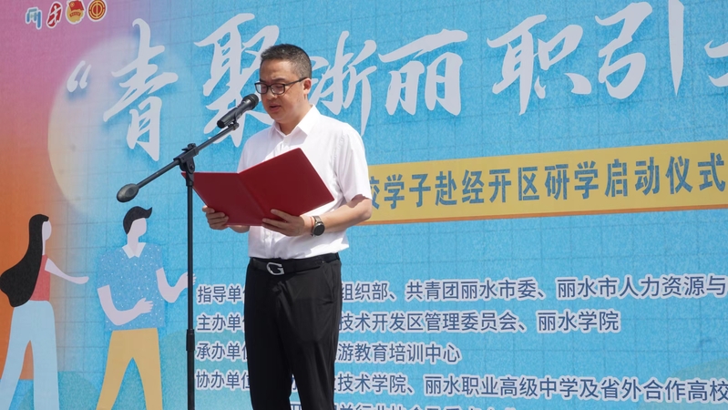 仪式上,举行了研学团授旗仪式,学生代表李昊昕宣读丽水青年研学倡议书。仪式结束后,首批100名学子乘坐大巴前往经济开发区开启研学之旅。