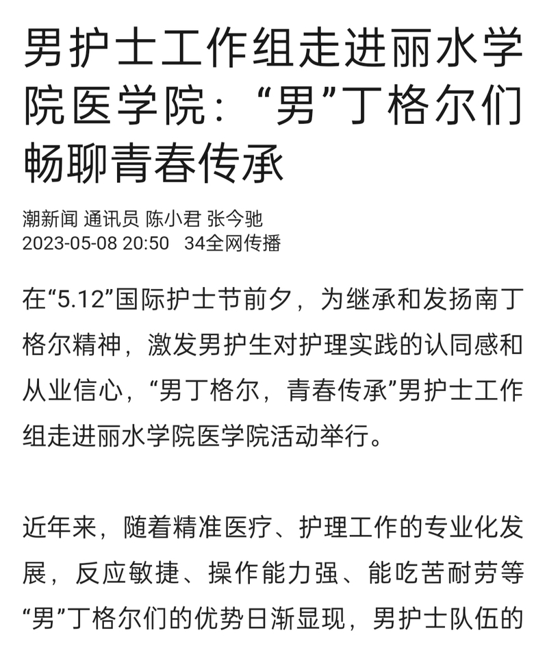 5月8日,潮新闻客户端刊发了我校举行“男丁格尔,青春传承”男护士工作组走进丽水学院医学院活动的消息。