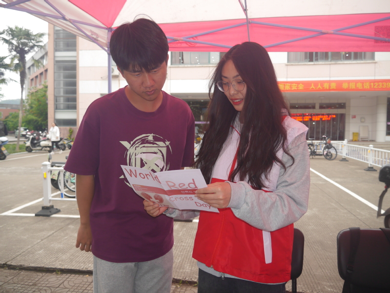 在东区金桥食府前,急救先锋联盟通过分发宣传册,耐心细致地宣传应急救护、备灾防灾常识,无偿献血、器官遗体捐献,中暑、气管异物等常见急症和触电、蛰伤等意外伤害的相关知识。倡导师生主动学习急救技能,积极投身红十字志愿服务,用自己的善行义举撑起人间大爱。