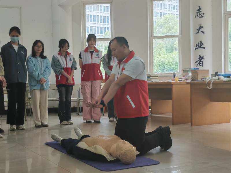 “按压时双手十指相扣,掌根重叠,利用上身的力量进行按压……”指导老师王久鹏阐述了心肺复苏在抢救呼吸、心脏骤停人员时的重要意义,对心肺复苏患者的识别及评估、心肺复苏的急救步骤、动作要领、注意事项以及抢救成功的有效指标等进行细致讲解,分解演示每一环节的体位和手法技巧,并邀请同学们现场体验心肺复苏操作,指导按压部位的准确性、力度的大小、频率的快慢等。经过培训,同学们基本了解了心脏骤停急救生存链及心肺复苏操作技能关键点,在面对突发状况时能够敢于施救。