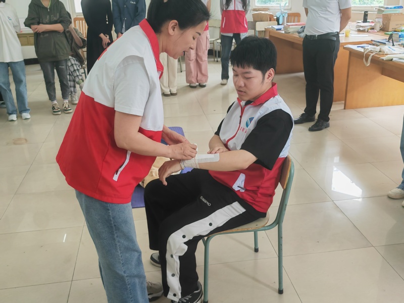指导老师张凯波讲解并示范了伤口出血的包扎步骤:消毒、清洗创面周围皮肤、无菌敷料覆盖伤口等,以及不同部位出血的包扎方法,如手背出血采取八字包扎法、前臂出血采取螺旋包扎法、头部出血用三角巾包扎、手指跨关节出血裁剪创可贴包扎法。
