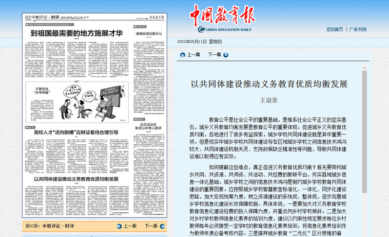 5月11日,中国教育报刊发了我校教师王淑莲的署名文章《以共同体建设推动义务教育优质均衡发展》。