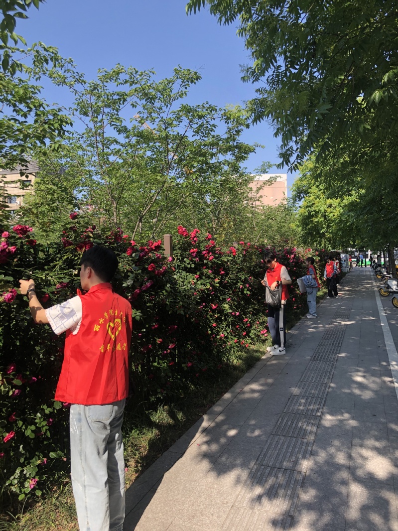 月季花期长,当月季花朵完全打开,开始向下或者向外卷的时候,及时进行花后修剪,调整株形,可以减少植株的养分消耗,帮助月季更好地生长,以便于后续开更多的花。活动现场气氛热烈,同学们三两结对,协同进行,井然有序地开展修剪、清理枯萎花朵的工作。同学还会将修剪下来的花朵制作成腮红,在第十一届生态科技文化节上进行展示,实现专业学习、劳动教育、实践展示有机结合。
