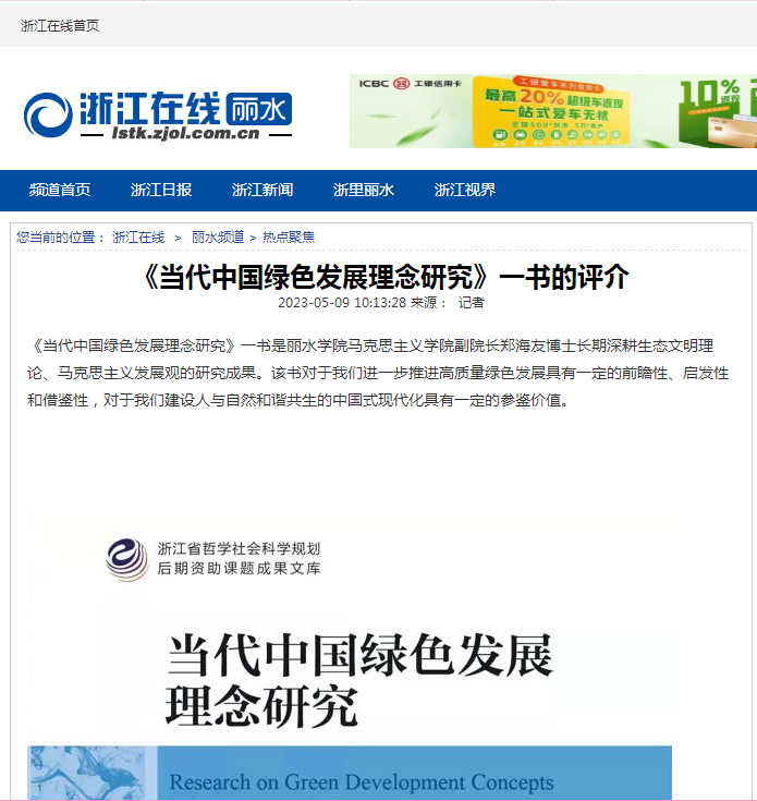 5月9日,浙江在线刊发了我校教师郑海友的专著《当代中国绿色发展理念研究》的书评内容。